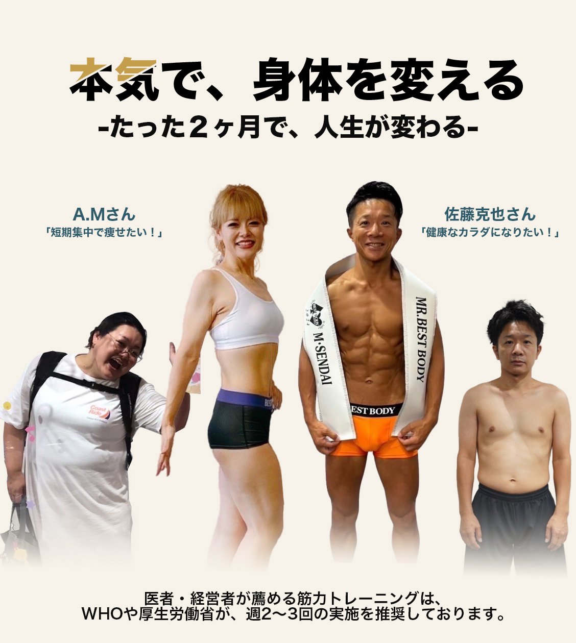 定禅寺通本店店長の佐藤です。私自身がボディメイクを通じて得た経験をもとに、ダイエット・ボディメイクのサポートをさせて頂きます!