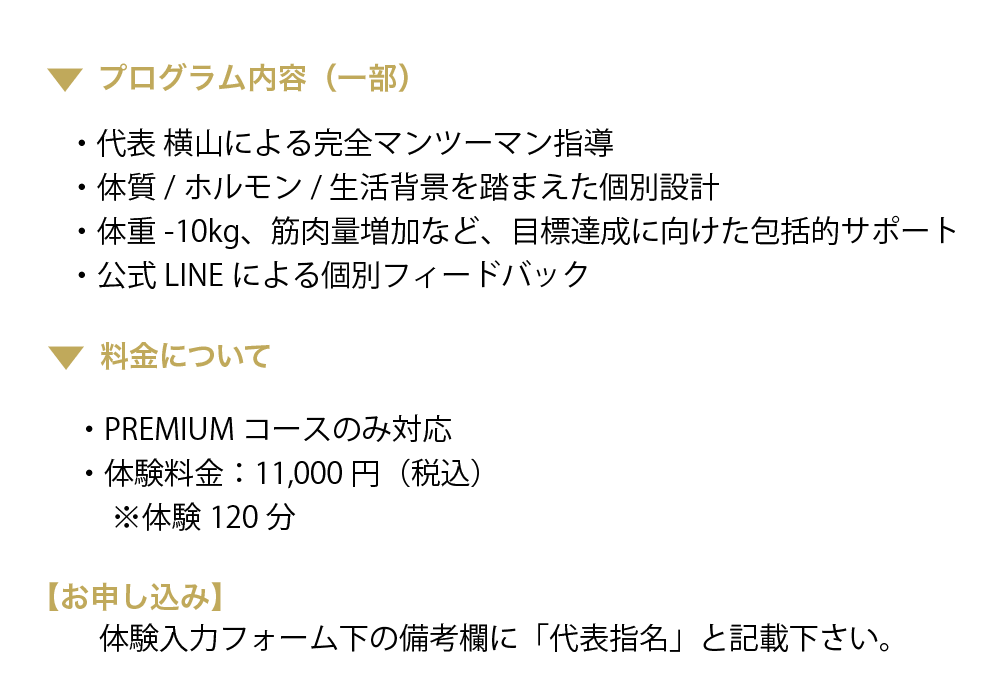 ※premium16回コース以降は、1回当たりの単価がstandardコースと同様なり食事・自主トレ管理サービスは永年無料となります。
